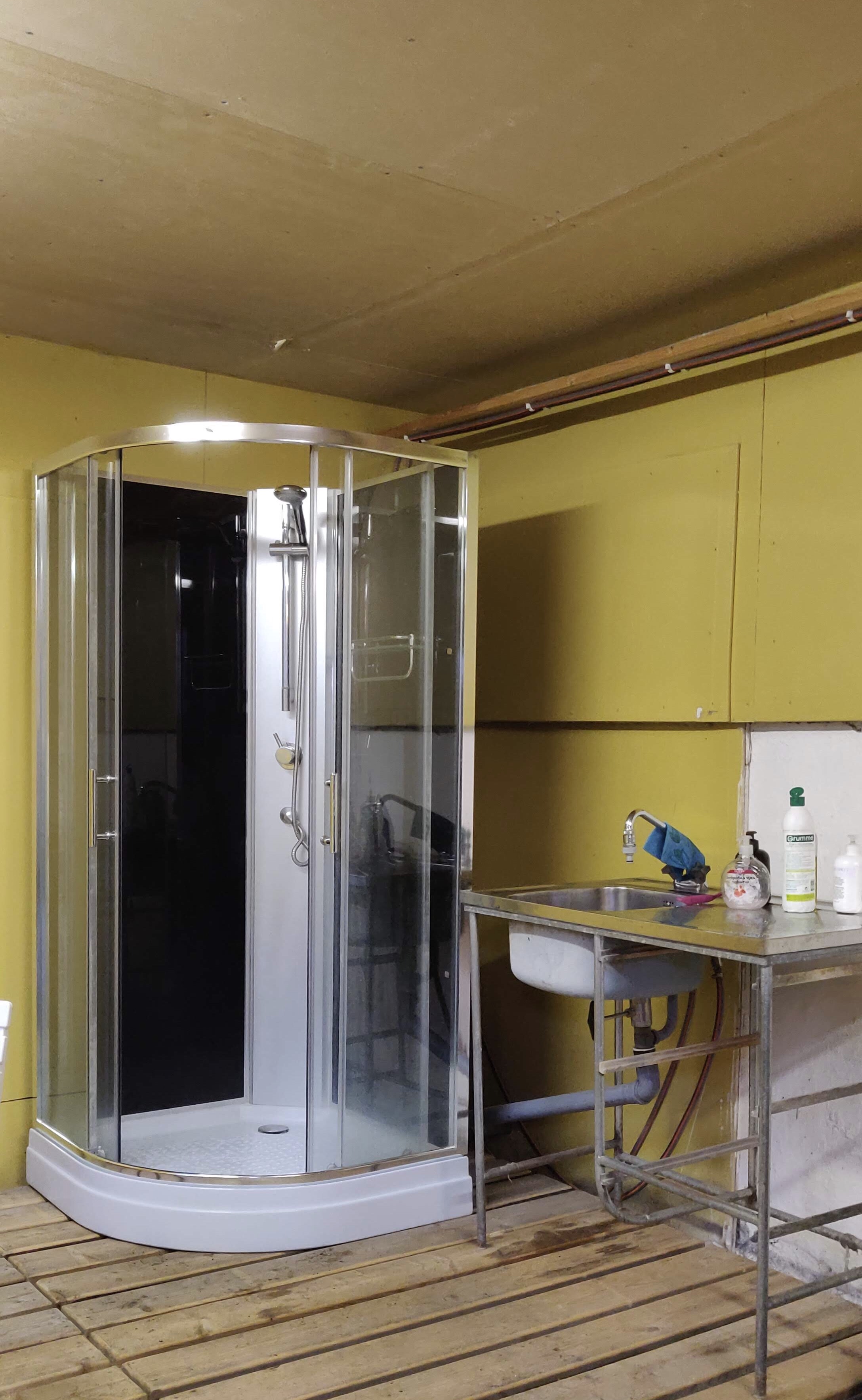 Vi har en stuga med 4 bäddar med tillgång till dusch och andra förnödenheter i en annan byggnad. Utedass finns på gården.